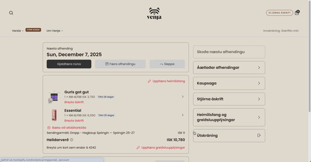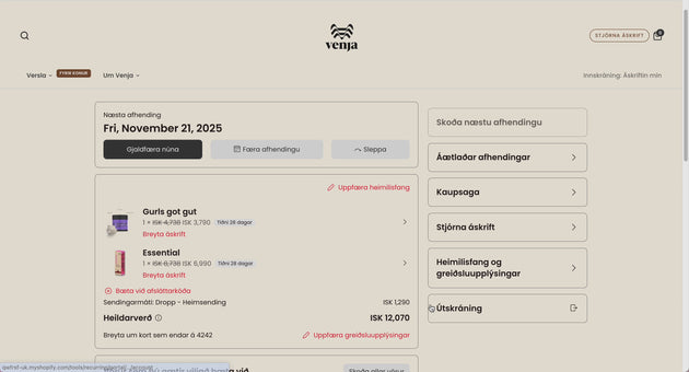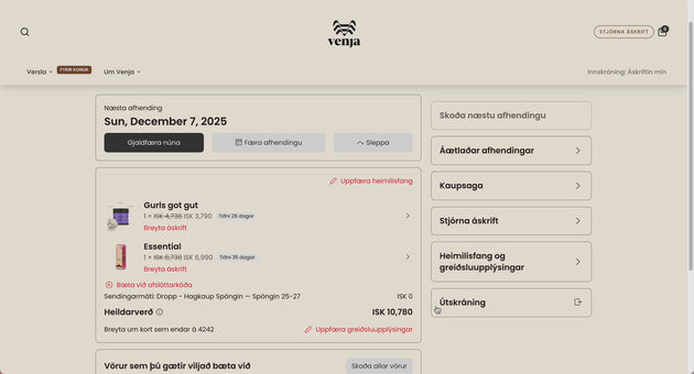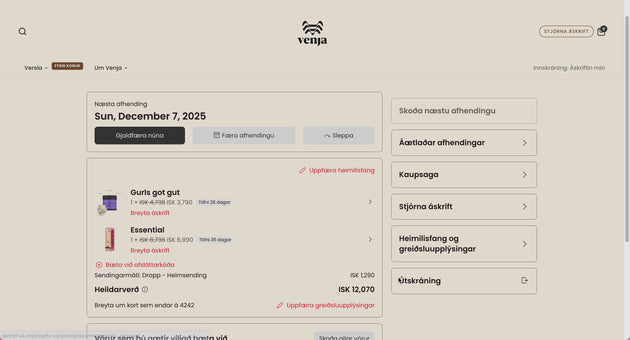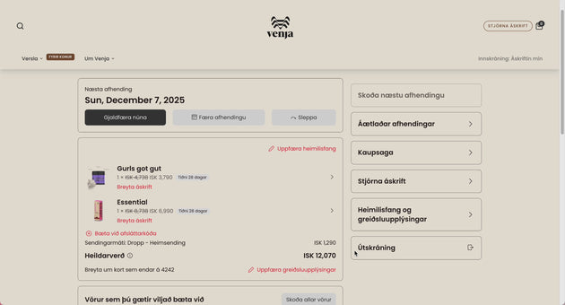 Þegar þú kemur inn á mínar síður færðu yfirlit yfir næstu afhendingu. Undir „Stjórna áskrift“ sérðu allar áskriftirnar þínar. Ef þú smellir á áskriftarvöru geturðu auðveldlega breytt afhendingardegi, sleppt næstu afhendingu, stillt tíðni eða skipt um vöru.