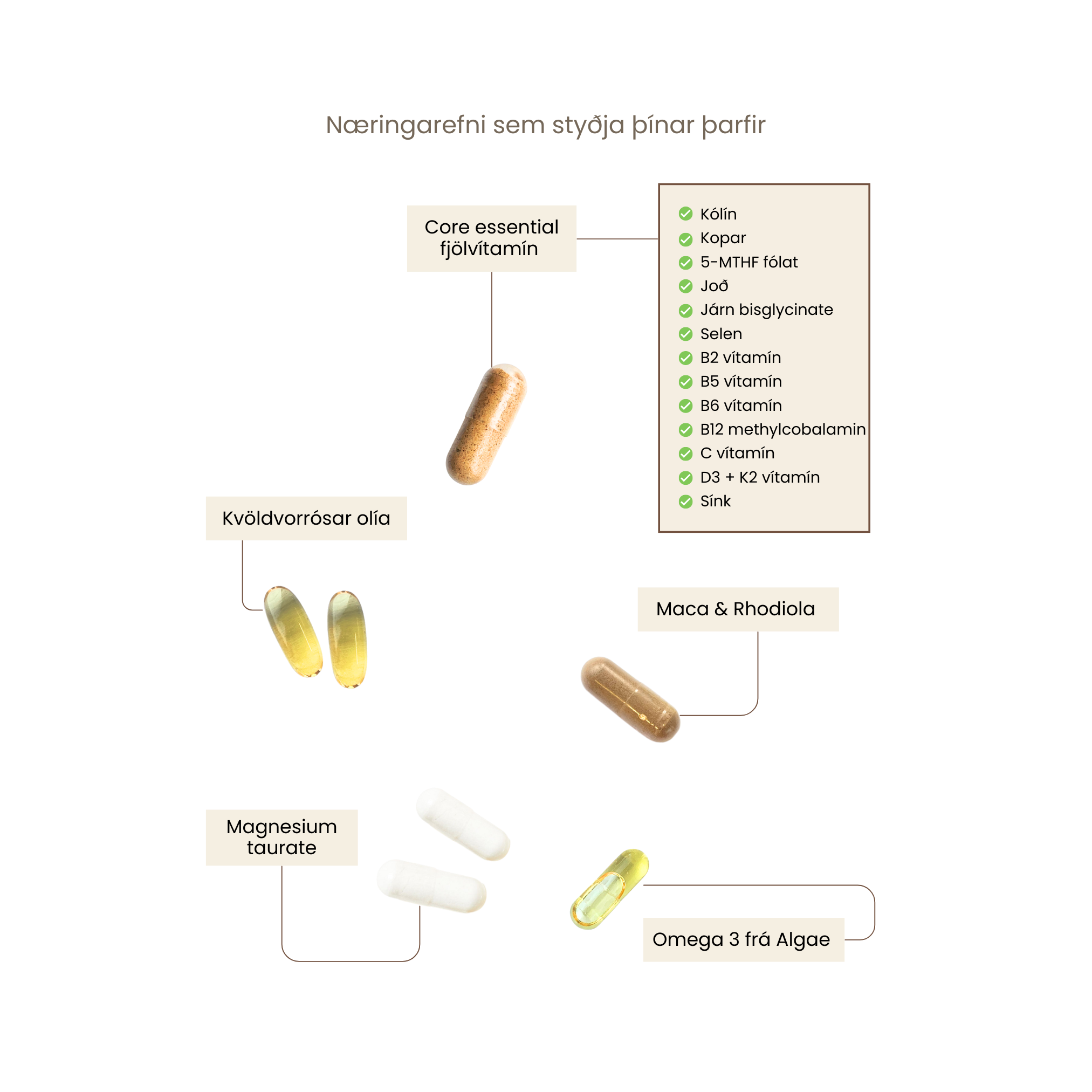 Virk innihaldsefni: Choline bitartrate (Vitacholine®), ascorbic acid, zinc bisglycinate chelate, ferrous bisglycinate chelate (Ferrochel®), pyridoxal 5’-phosphate, natural mixed tocopherols, riboflavin 5’-phosphate, calcium pantothenate, copper citrate, (6S)-5-MTHF*** glucosamine salt (Quatrefolic®), methylcobalamin, potassium iodide, menaquinone-7 (K2VITAL®), cholecalciferol (vegan), sodium selenite.